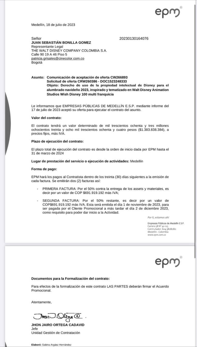 En el documento firmado por Jhon Jairo Ortega, jefe de la unidad de gestión de contratación se le comunica a Juan Sebastián Bonilla, Representante Legal de Walt Disney en Colombia, que fue aceptada su propuesta.