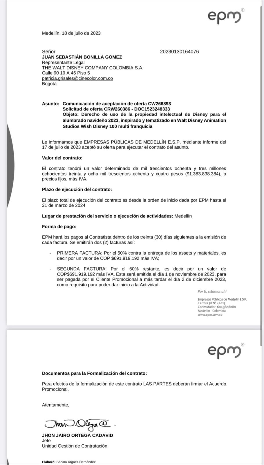 En el documento firmado por Jhon Jairo Ortega, jefe de la unidad de gestión de contratación se le comunica a Juan Sebastián Bonilla, Representante Legal de Walt Disney en Colombia, que fue aceptada su propuesta.