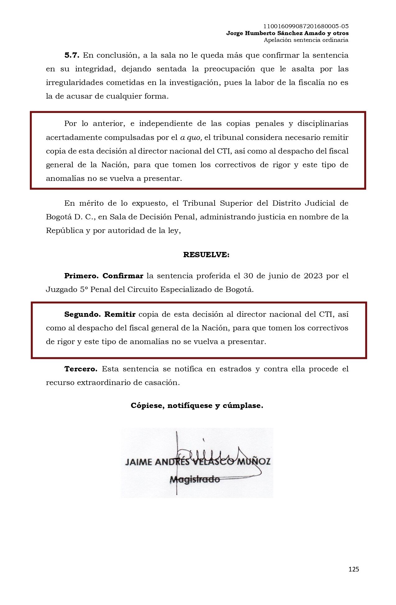 El Tribunal remitió copia de esta decisión al director nacional del CTI, así como al despacho del fiscal general de la Nación, para que tomen los correctivos de rigor y este tipo de anomalías no se vuelva a presentar.