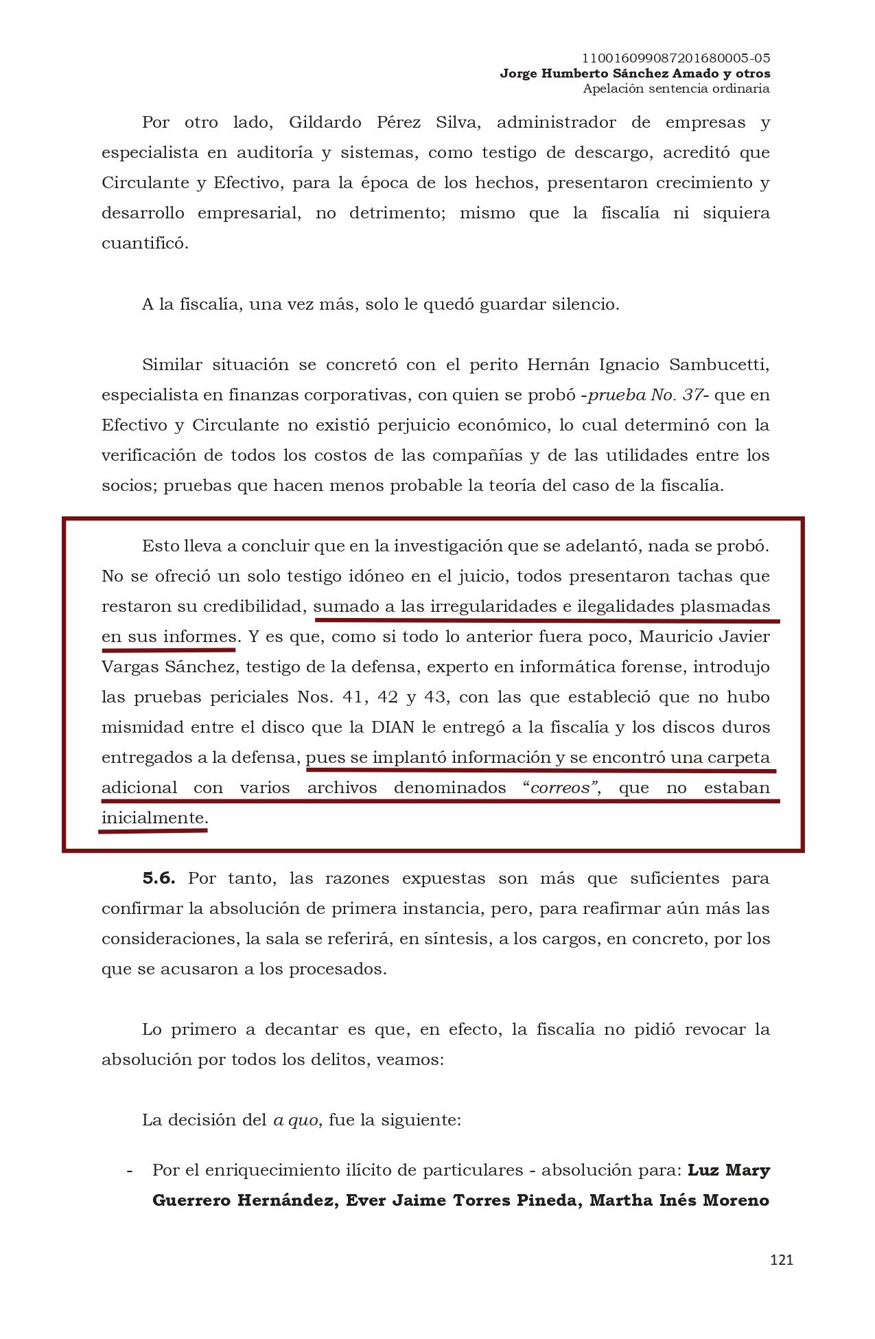 “Esto lleva a concluir que en la investigación que se adelantó, nada se probó. No se ofreció un solo testigo idóneo en el juicio, todos presentaron tachas que restaron su credibilidad, sumado a las irregularidades e ilegalidades plasmadas en sus informes. Y es que, como si todo lo anterior fuera poco, Mauricio Javier Vargas Sánchez, testigo de la defensa, experto en informática forense, introdujo las pruebas periciales Nos. 41, 42 y 43, con las que estableció que no hubo mismidad entre el disco que la DIAN le entregó a la fiscalía y los discos duros entregados a la defensa, pues se implantó información y se encontró una carpeta adicional con varios archivos denominados “correos”, que no estaban inicialmente”, se indica en la sentencia.