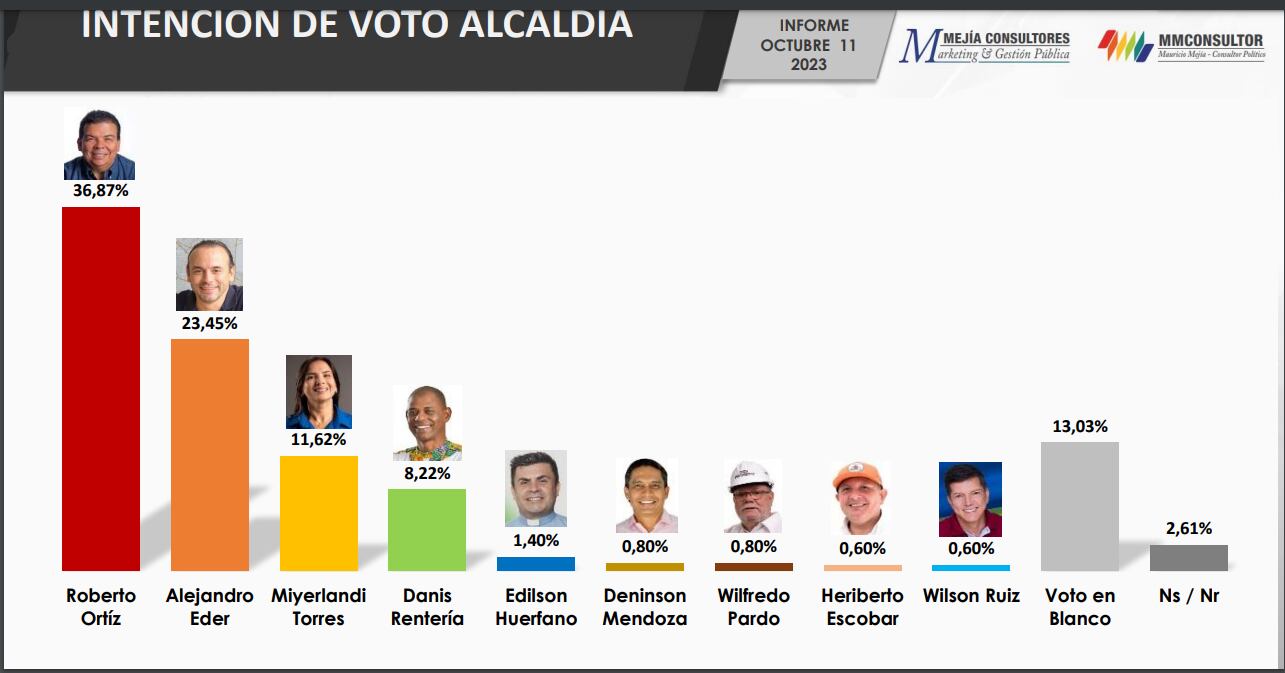 Roberto Ortiz representa el 36,87% de la intención de voto, Alejandro Eder el 23.45%, Miyerlandi Torres el11,62% y Danis Rentería el 8,22%.
