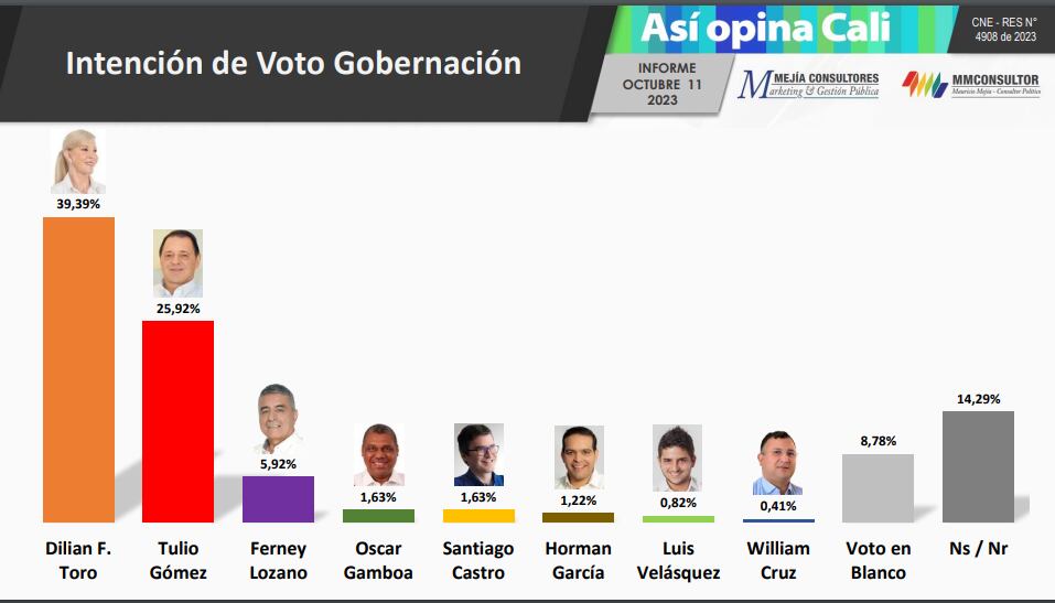 En cuanto a la intención de voto para la gobernación del Valle del Cauca la lidera Dilian Francisca Toro con un 39,39%, le sigue Tulio Gómez con un 25,92% y en tercer lugar estaría el voto en blanco con el 8,78% en cuanto a los candidatos seguiría Ferney Lozano con el 5,92%, Oscar Gamboa y Santiago Castro tendrían el 1,63%.