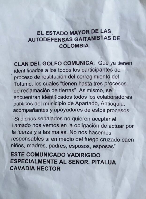 La reciente amenaza se hizo contra personas que perdieron su tierra en la vereda El Totumo del municipio de Necoclí, así como a funcionarios públicos e instituciones que acompañamos este tipo de procesos.