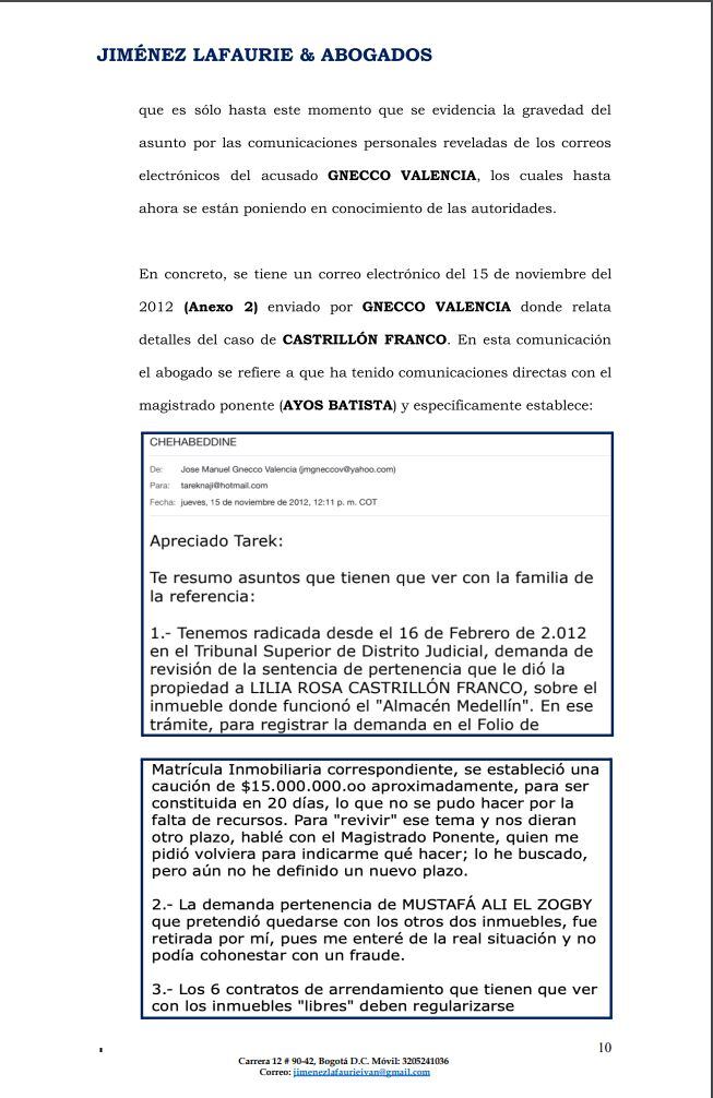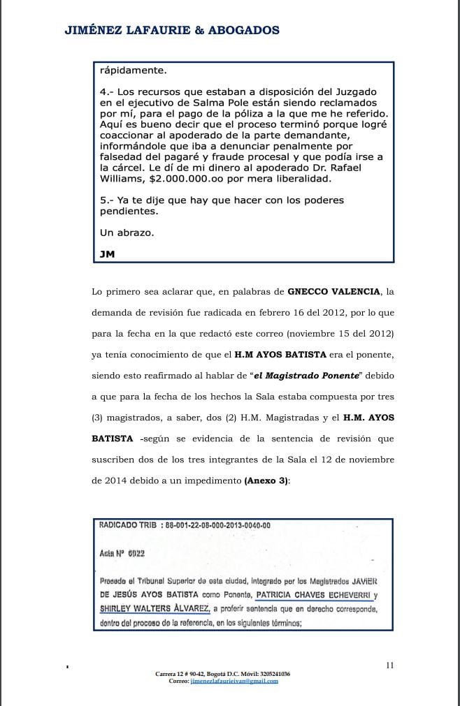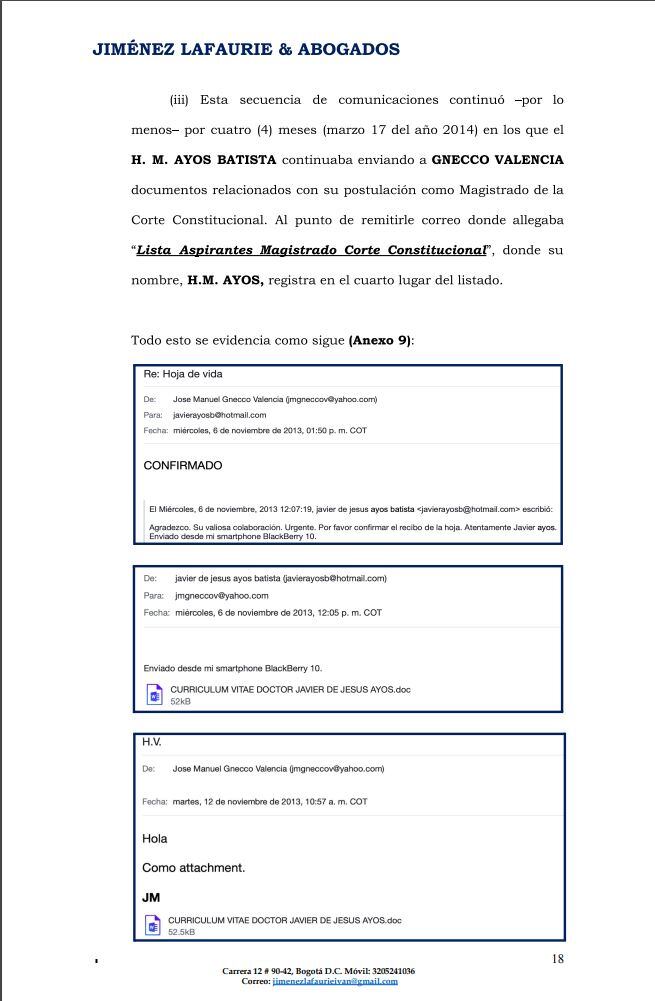 Y el tercer punto. Existen unos correos entre el procesado José Manuel Gnecco, y el magistrado de San Andrés Javier de Jesús Ayos Batista, en los que ese magistrado habría pedido ayuda a Gnecco para que le ayudara y le colaborara para impulsarlo y poder llegar a la Corte Constitucional.