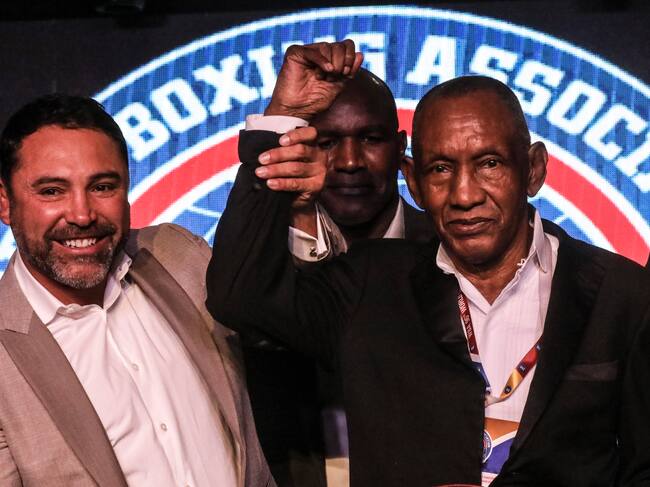 Oscar de la Hoya, Evander Hollyfield y Antonio Cervantes "Kid" Pambele en la 96° Gala del World Boxing Association Convention en Medellin 2017 (Photo credit should read JOAQUIN SARMIENTO/AFP via Getty Images) / AFP Contributor