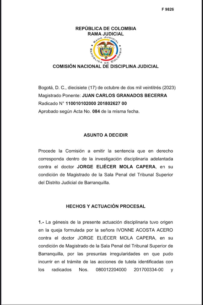 La Comisión Nacional de Disciplina Judicial determinó que el magistrado Mola Capera incurrió en falta gravísima a título de dolo, abusando de su cargo e incumpliendo los deberes de su investidura como magistrado del Tribunal Superior de Barranquilla.
