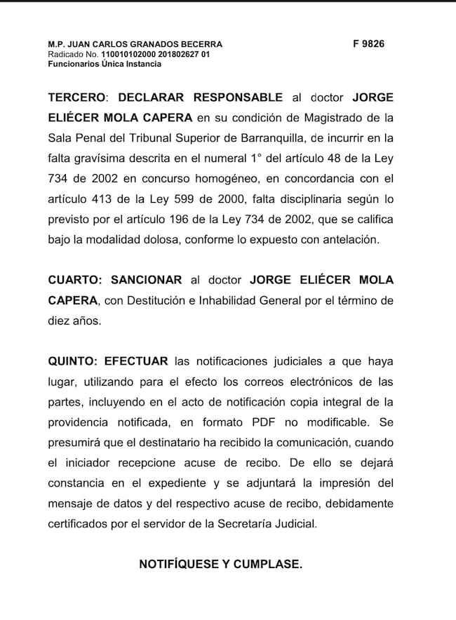 La Comisión Nacional de Disciplina Judicial decidió en las últimas horas destituir e inhabilitar por diez años al magistrado Jorge Eliécer Mola Capera, miembro de la Sala Penal del Tribunal Superior de Barranquilla.
