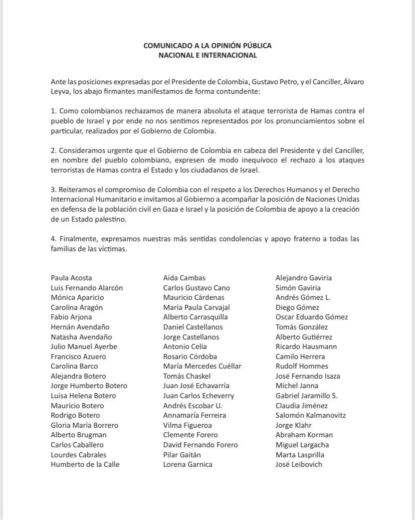 En una carta 126 exministros, empresarios, exembajadores y otras personalidades del país, rechazaron de manera absoluta el ataque terrorista de Hamas contra el pueblo de Israel, y manifestaron que no se sienten representados por los pronunciamientos realizados por el Gobierno de Colombia.