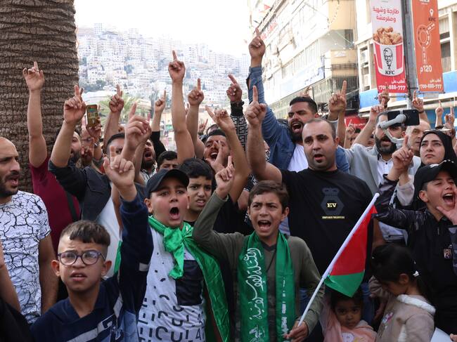 Nablus (-), 18/10/2023.- Palestinians protest against Israel's war on Gaza, in the West Bank city of Nablus 18 October 2023. According to Palestinian authorities in Gaza hundreds of people have been killed in an blast at the hospital in Gaza on 17 October. Israel has denied responsibility and said a Hamas rocket misfire caused the blast. More than 3,000 Palestinians and 1,400 Israelis have been killed according to the Israel Defense Forces (IDF) and the Palestinian Health authority since Hamas militants launched an attack against Israel from the Gaza Strip on 07 October. Israel has warned all citizens of the Gaza Strip to move to the south ahead of an expected invasion. (Protestas) EFE/EPA/ALAA BADARNEH / ALAA BADARNEH (EFE)