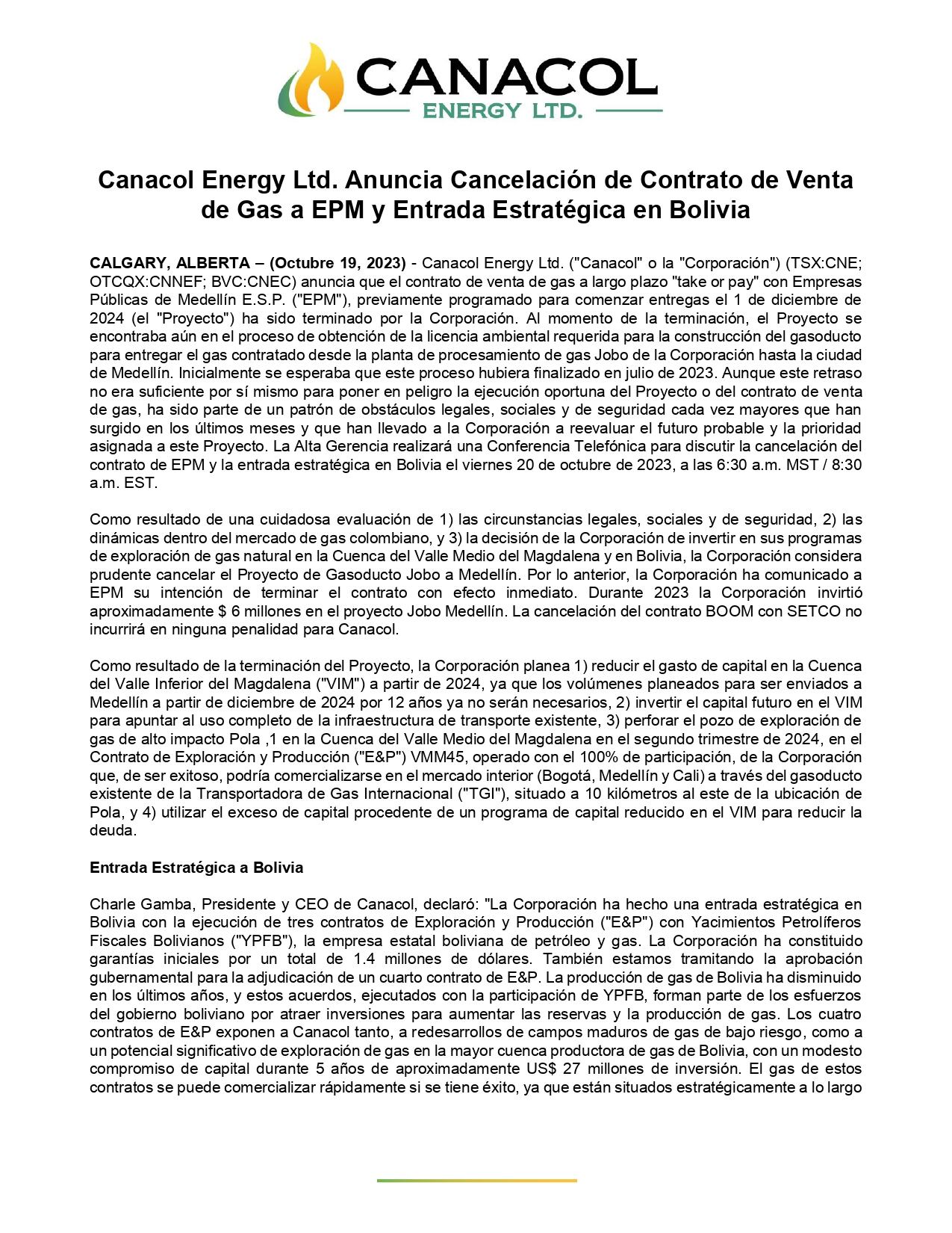 Mediante un comunicado publicado en información relevante de la Superintendencia Financiera de Colombia, la compañía CANACOL Energy hizo el anuncio de que por varios factores ajenos a sus capacidades decidía cancelar el contrato que había firmado con EPM y que debía ser entregado en diciembre del 2024, además, que esta decisión no generaría ninguna penalidad para las partes involucradas.