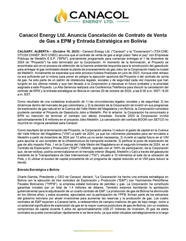 Comunicado CANACOL Energy