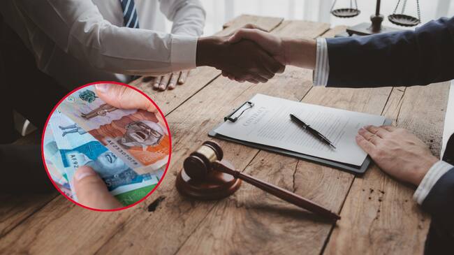 Abogados estrechando la mano, frente a un juez de justicia / Dinero colombiano (Getty Images)