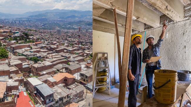 Vista aérea de una zona de Bogotá y trabajadores de construcción revisando una vivienda. (Getty Images)