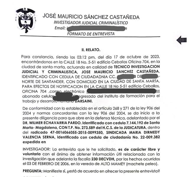 W Radio también buscó conocer la posición del abogado Wilmar Echavarría Pardo comprometido gravemente en la denuncia; por ello se le solicitó al investigador Sánchez informar al señor Echavarría de los hechos y facilitar un medio de contacto para conocer su posición ya que dicho litigante fue quien lo contrató, pero desde ese momento dejó de responder los mensajes por correo electrónico.