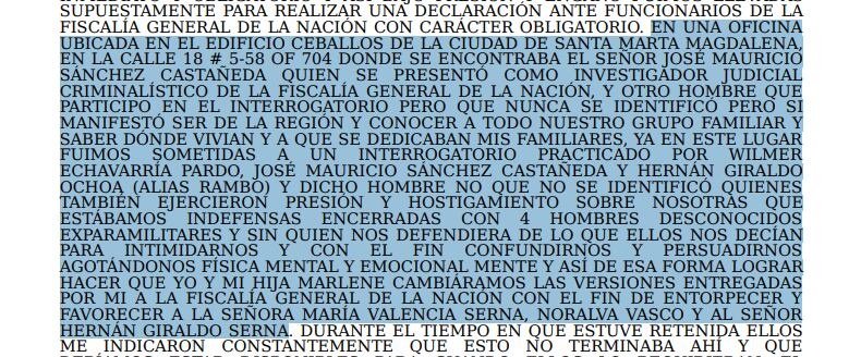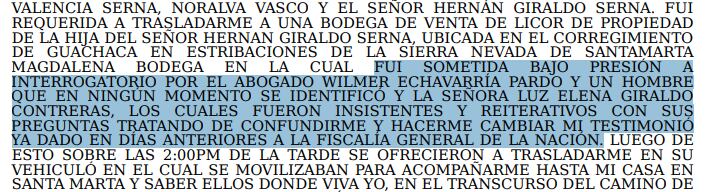 Según lo escrito en la denuncia y también narrado por la víctima en La W, su abuela de 75 años fue contactada y citada a una bodega en el corregimiento de Guachaca (Sierra Nevada de Santa Marta) para que declarara “en favor” de Hernán Giraldo y Valencia Serna.