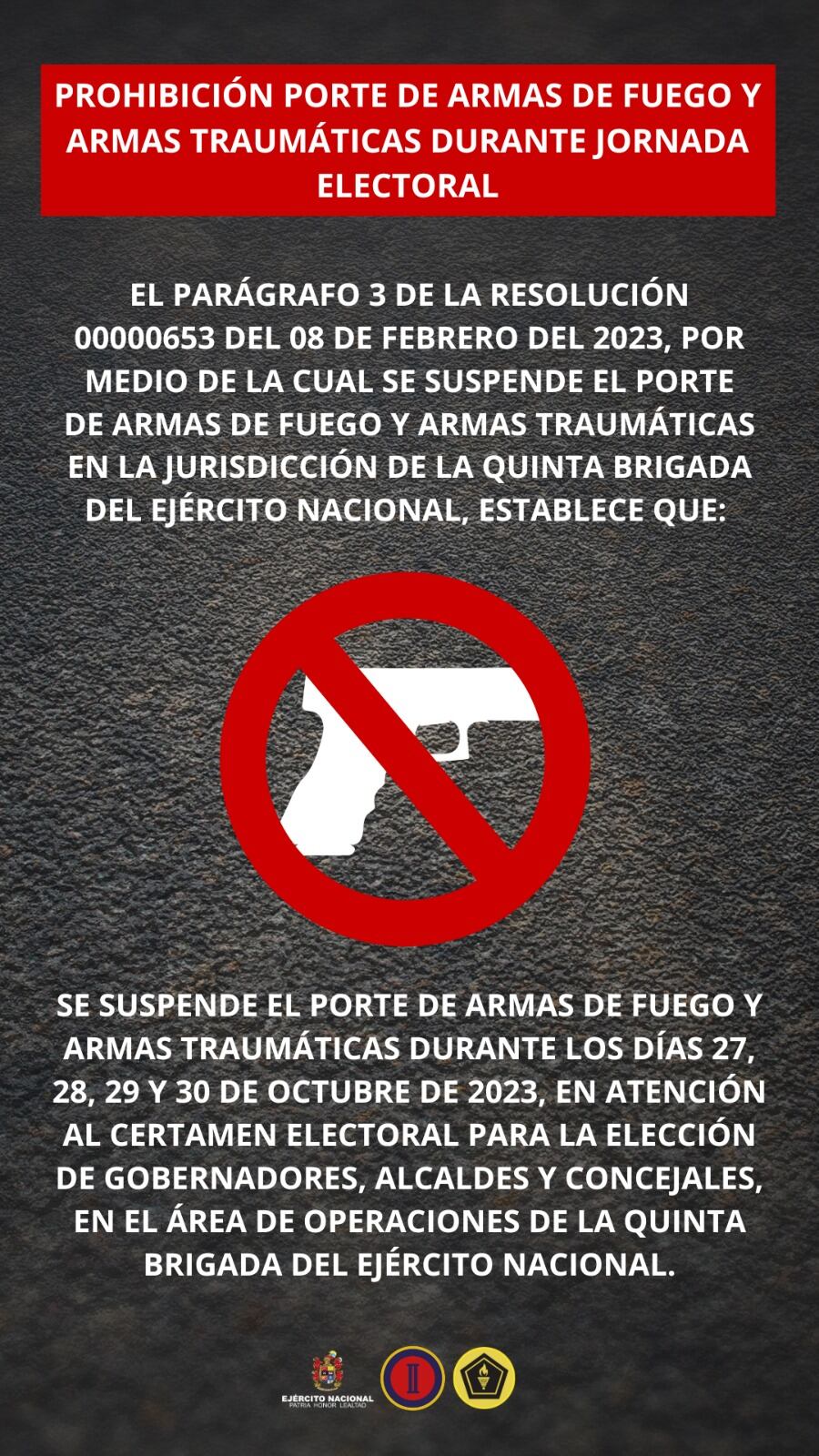 Desde el próximo viernes 27 de octubre se adoptará la medida que suspende el porte de armas de fuego y traumáticas en todo el departamento de Santander.