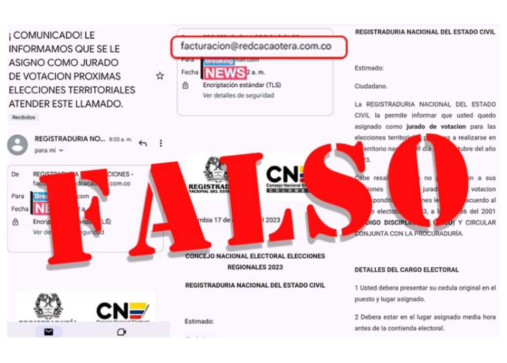 “Aclara que estas comunicaciones son falsas. Invitamos a los ciudadanos a no caer en ellas y denunciarlas. Estas fake news provienen de cuentas de correo electrónico particulares. La Registraduría Nacional aclara que no utilizamos correos electrónicos para notificar los asuntos antes mencionados”, explicó Guevara.