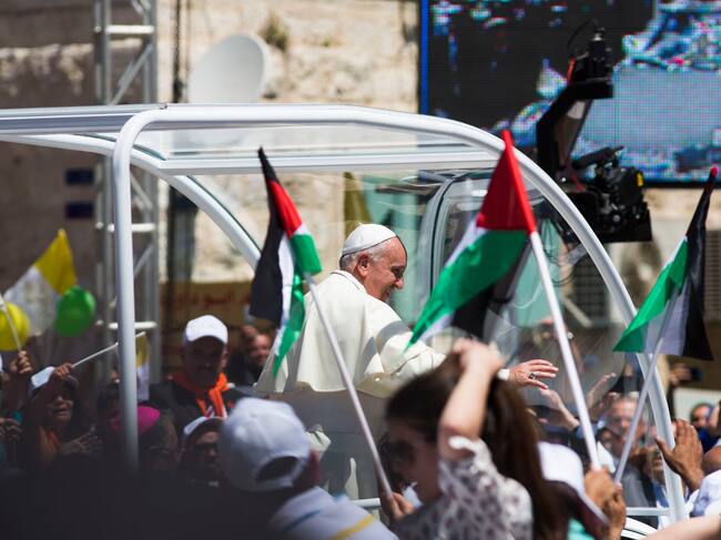 BETHLEHEM, WEST BANK - MAY 25: Pope Francis arrives in Manger Square to take part in a Mass held at the Church of Nativity as crowds watch and wave flags in the foreground on May 25, 2014, in Bethlehem, West Bank. Pope Francis addressed the Israeli-Palestinian conflict as "unacceptable" and urged both sides to find courage in seeking a peaceful solution. (Photo by Ilia Yefimovich/Getty Images) / Ilia Yefimovich