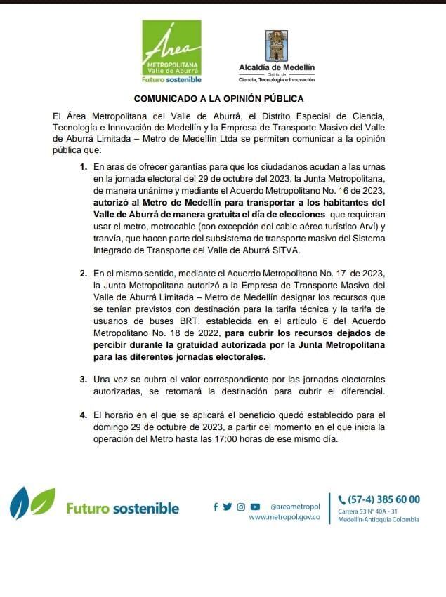 La Junta Directiva de la entidad Área Metropolitana informó que de manera unánime autorizaron al Metro de Medellín a operar este domingo 29 de octubre día de elecciones de manera gratuita para que las personas puedan movilizarse sin contratiempos a los puestos de votación del Valle de Aburrá. Así quedó registrado mediante el Acuerdo Metropolitano No. 16 de 2023.