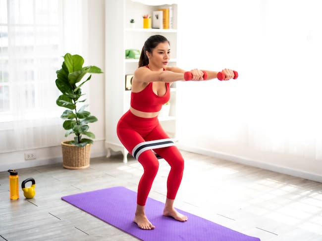 Mujer haciendo ejercicio en casa con unas pesas y una banda elástica (Foto vía Getty Images) / Papakon Mitsanit