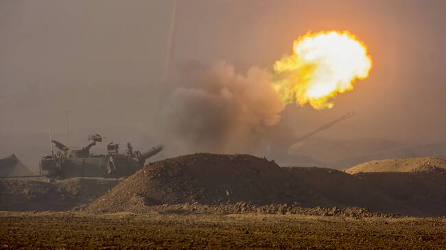 Soldados de las Fuerzas de Defensa de Israel (FDI) disparan un obús de 155 mm en un lugar no revelado cerca de la frontera con Gaza, sur de Israel. EFE/HANNIBAL HANSCHKE / HANNIBAL HANSCHKE (EFE)