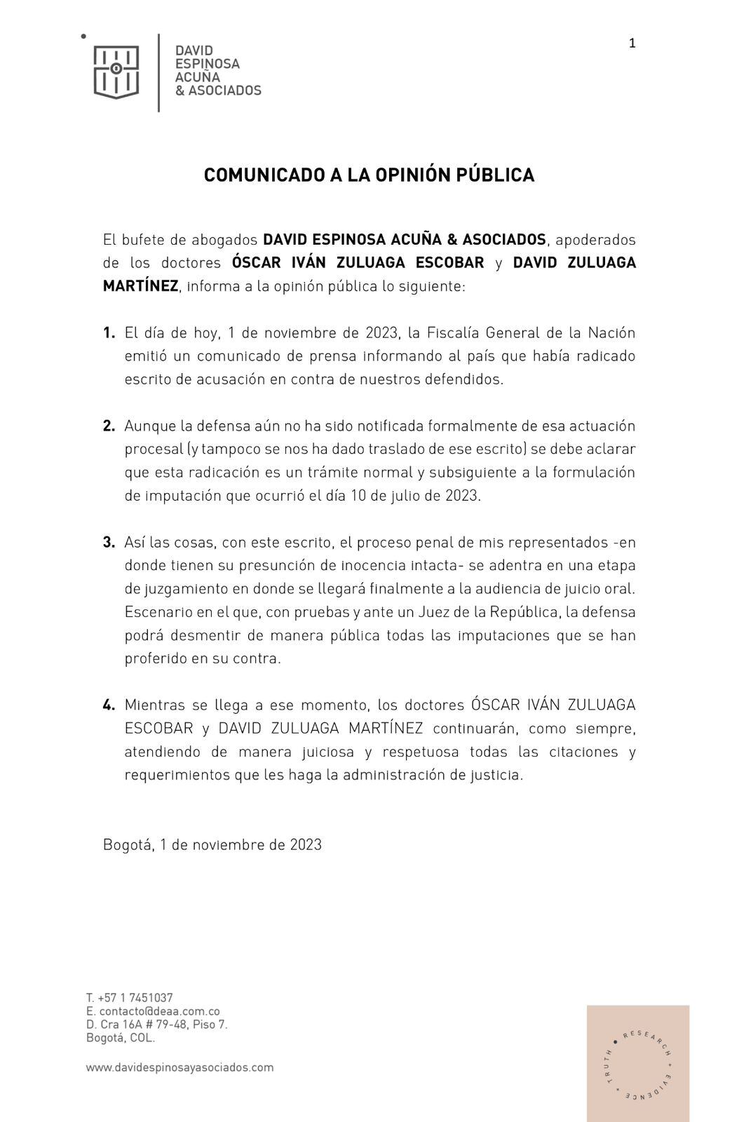 La defensa del excandidato presidencial Óscar Iván Zuluaga y su hijo David Zuluaga, en un comunicado señaló que irá a juicio a demostrar la inocencia de sus clientes.
