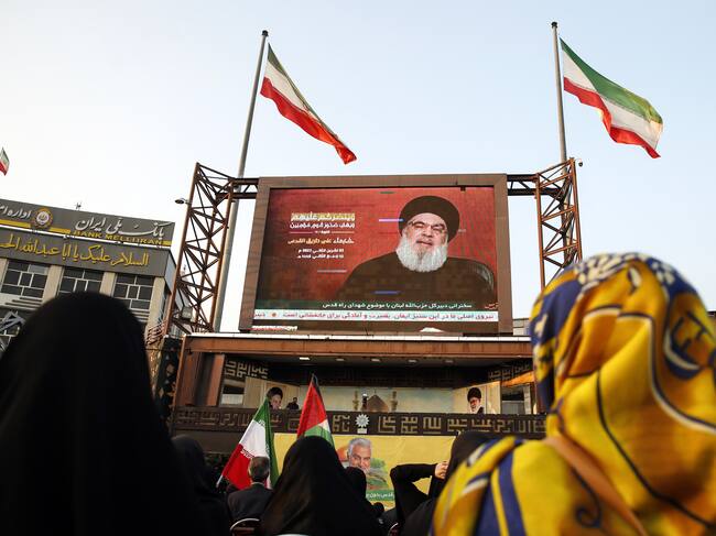Tehran (Iran(islamic Republic Of)), 03/11/2023.- Palestinians' supporters listen to the speech of Hezbollah Secretary General Hassan Nasrallah during a gathering in Imam Hussein square, in Tehran, Iran, 03 November 2023. Thousands of Israelis and Palestinians have died since the militant group Hamas launched an unprecedented attack on Israel from the Gaza Strip on 07 October, and the Israeli strikes on the Palestinian enclave which followed it. (Protestas, Teherán, Hizbulá/Hezbolá) EFE/EPA/ABEDIN TAHERKENAREH / ABEDIN TAHERKENAREH (EFE)