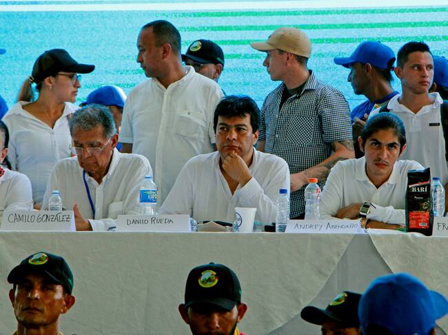 El vocero de la delegación del EMC, Andrey Avendaño; el alto comisionado para la paz de Colombia, Danilo Rueda, y Camilo González (i), en el municipio de Tibú (Colombia). EFE/ Mario Caicedo / Mario Caicedo (EFE)