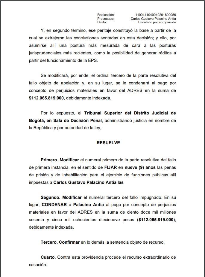 El Tribunal concluyó que, sin asomo de duda, Carlos Gustavo Palacino Antía se aprovechó de la figura societaria y, en su rol de administrador, manipuló los estados financieros con el propósito de implementar un plan de negocios claramente dirigido a apropiarse, a favor de la empresa, de los recursos de naturaleza pública, en perjuicio no solo del erario sino de la salud de los millones de afiliados que llegó a tener SaludCoop.