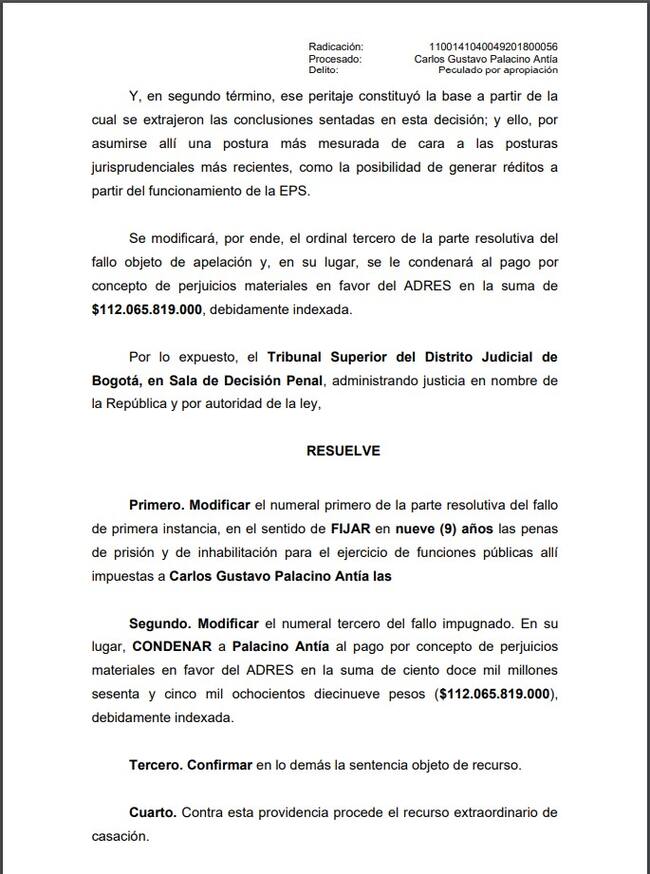 Palacino fue condenado porque desvió más de $296 mil millones de los parafiscales para su beneficio personal.