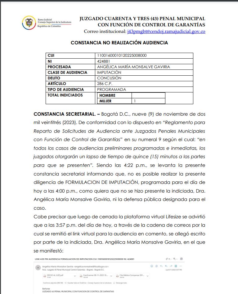 En la primera citación, la fiscal Monsalve no respondió llamadas, apagó su celular, y tampoco contestó los correos que remitió el juzgado. En la segunda ocasión, envió un correo diciendo que no la notificaron a tiempo y que tenía muchas por hacer, por ello no asistió.