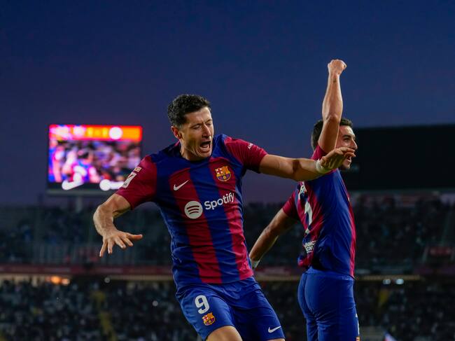 BARCELONA 12/11/2023.- El delantero polaco del Barcelona, Robert Lewandowski (i) celebra uno de sus goles, durante el partido correspondiente a la jornada 13 de LaLiga que disputan FC Barcelona y Deportivo Alavés este domingo. EFE/ Alejandro García / Alejandro García (EFE)