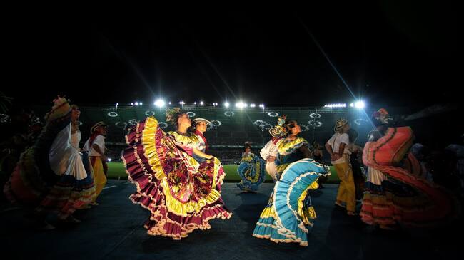 Luego de la presentación, llegó el momento para la comparsa y los bailes típicos con los que se homenajeó a las regiones. Posteriormente, fue el turno para la salida de las 33 delegaciones que cruzaron la pista atlética del escenario deportivo. En medio de música y del lema “juntos”, se dio continuidad a la ceremonia con las palabras del gobernador de Risaralda, Víctor Tamayo, el alcalde de Pereira, Carlos Maya, y la ministra Astrid Rodríguez.