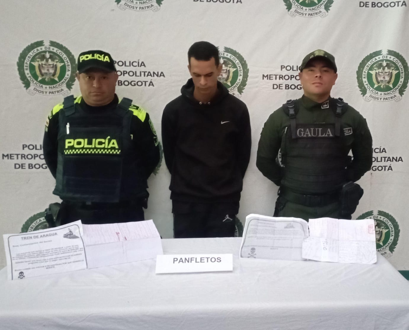“Unidades del Gaula estaban adelantando labores de campo cuando observaron al sujeto que estaba realizando exigencias económicas y entregando panfletos a nombre del Tren de Aragua. En la requisa se le hallaron panfletos alusivos al grupo criminal y hojas con los nombres de los establecimientos comerciales del sector”, indicó el coronel Carlos Téllez, comandante del Gaula.