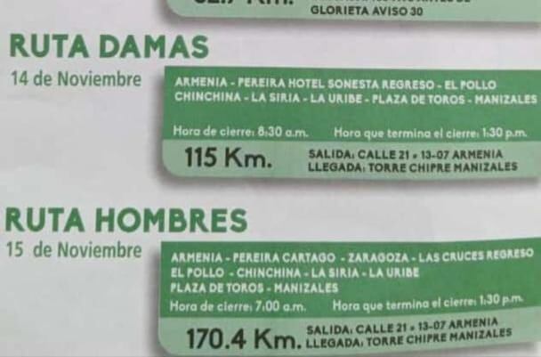 El secretario de tránsito de Armenia, Daniel Jaime Castaño indicó que desde las 6 de la mañana comenzarán los cierres en la plaza de Bolívar en la ciudad, las ciclistas tomarán la ruta calle 21, carrera 12, calle 20, carrera 13, calle 10, carrera 14 Avenida Bolívar y autopistas del café Pereira y hacia Manizales.