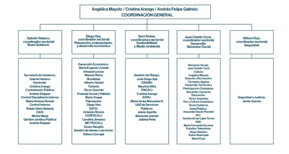 Las cinco coordinaciones sectoriales se dividieron así: Gabriel Velasco es coordinador sectorial de Buen Gobierno; Diego Hau es coordinador sectorial de Planeación, ordenamiento y desarrollo económico; Sara Rodas es coordinadora sectorial de Sostenibilidad y Medio Ambiente; Juan Camilo Cock es coordinador sectorial de Desarrollo y Bienestar Social; y Wilson Ruiz es coordinador sectorial de Seguridad.