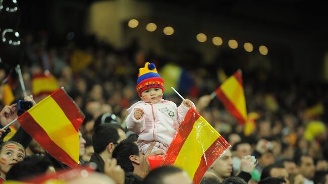 MADRID, SPAIN - FEBRUARY 09: A baby wears a hat with the Colombian colours while holding a Spanish flag during the International friendly match between Spain and Colombia at Estadio Santiago Bernabeu on February 9, 2011 in Madrid, Spain. (Photo by Denis Doyle/Getty Images) / Denis Doyle