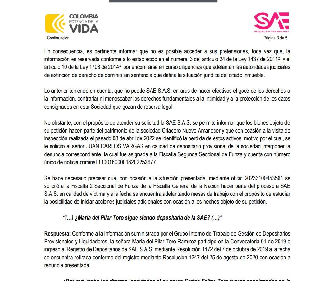Con respecto a la investigación de Caracol Radio que hemos documentado durante los últimos dos meses, la SAE dice que, ese robo se dio en abril de 2022 al Depositario Juan Carlos Vargas, quien en ese momento interpuso la respectiva denuncia ante la Fiscalía segunda Seccional de Funza, Cundinamarca.