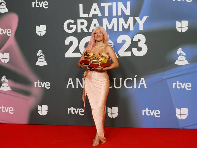 SEVILLA, 16/11/2023.- La cantante colombiana Karol G posa con los tres premios conseguidos, , mejor álbum del año, mejor álbum de música urbana y mejor fusión/interpretación urbana, durante la gala anual de los Latin Grammy celebrada este jueves en Sevilla. EFE/Jose Manuel Vidal / Jose Manuel Vidal