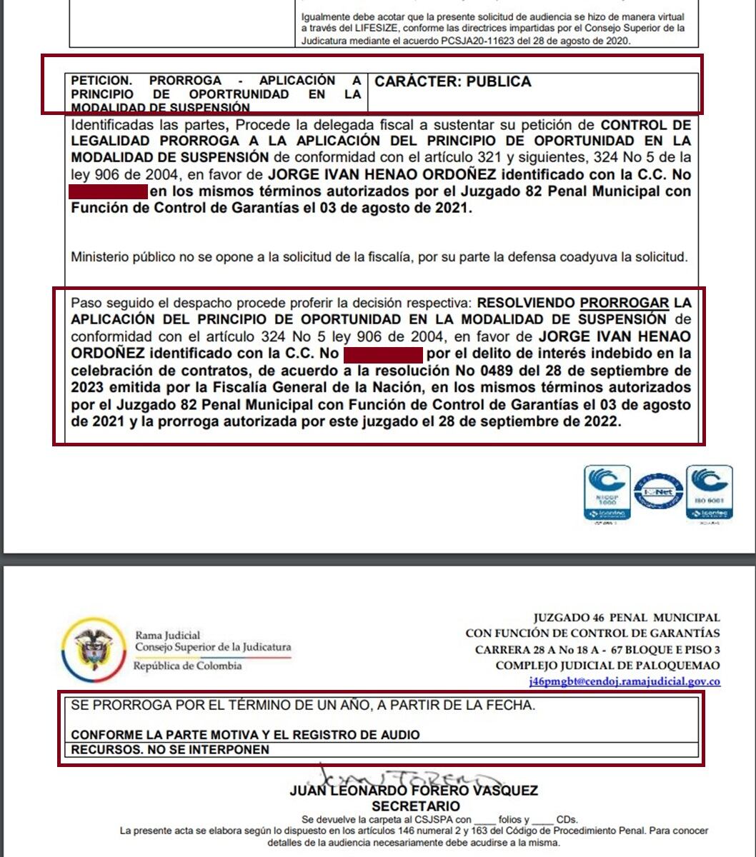 El juez le dio la razón a la Fiscalía y accedió a extender la inmunidad penal por el delito interés indebido en la celebración de contratos, en favor de Jorge Iván Henao porque la colaboración de ese testigo ha sido efectiva.