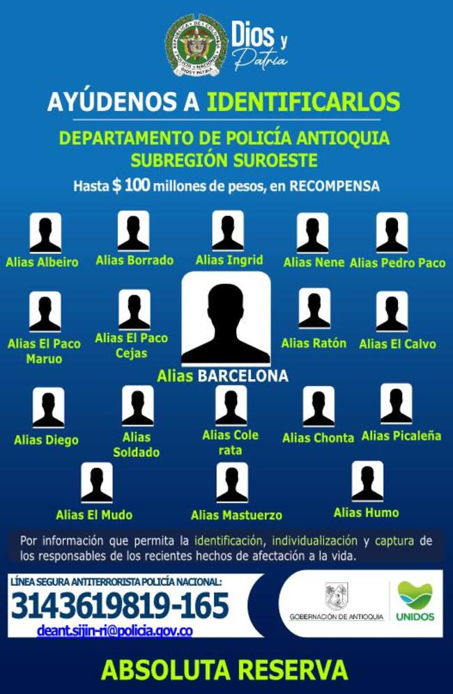 Las autoridades también publicaron un segundo cartel con las siluetas y los alias de 18 personas que por el momento no están identificadas plenamente, pero se requiere la ayuda de la comunidad especialmente del Suroeste de Antioquia.