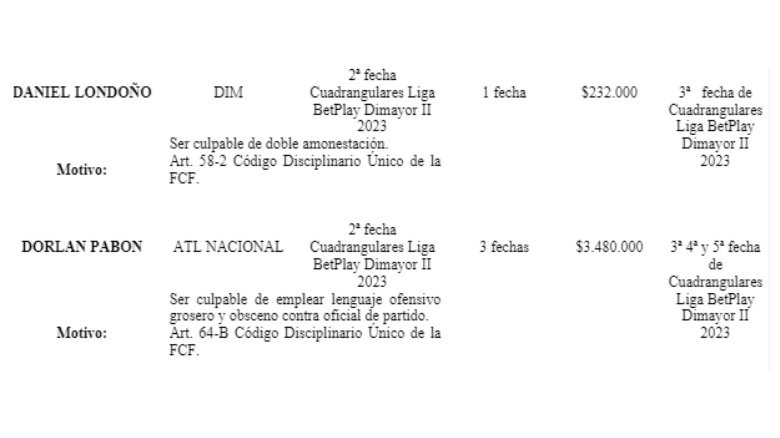 Por su parte, Cardona y Londoño recibieron la sanción mínima, solo tendrán que pagar una jornada de suspensión y apenas 232.000 pesos colombianos; una multa 10 veces menor a la que recibió Dorlan.