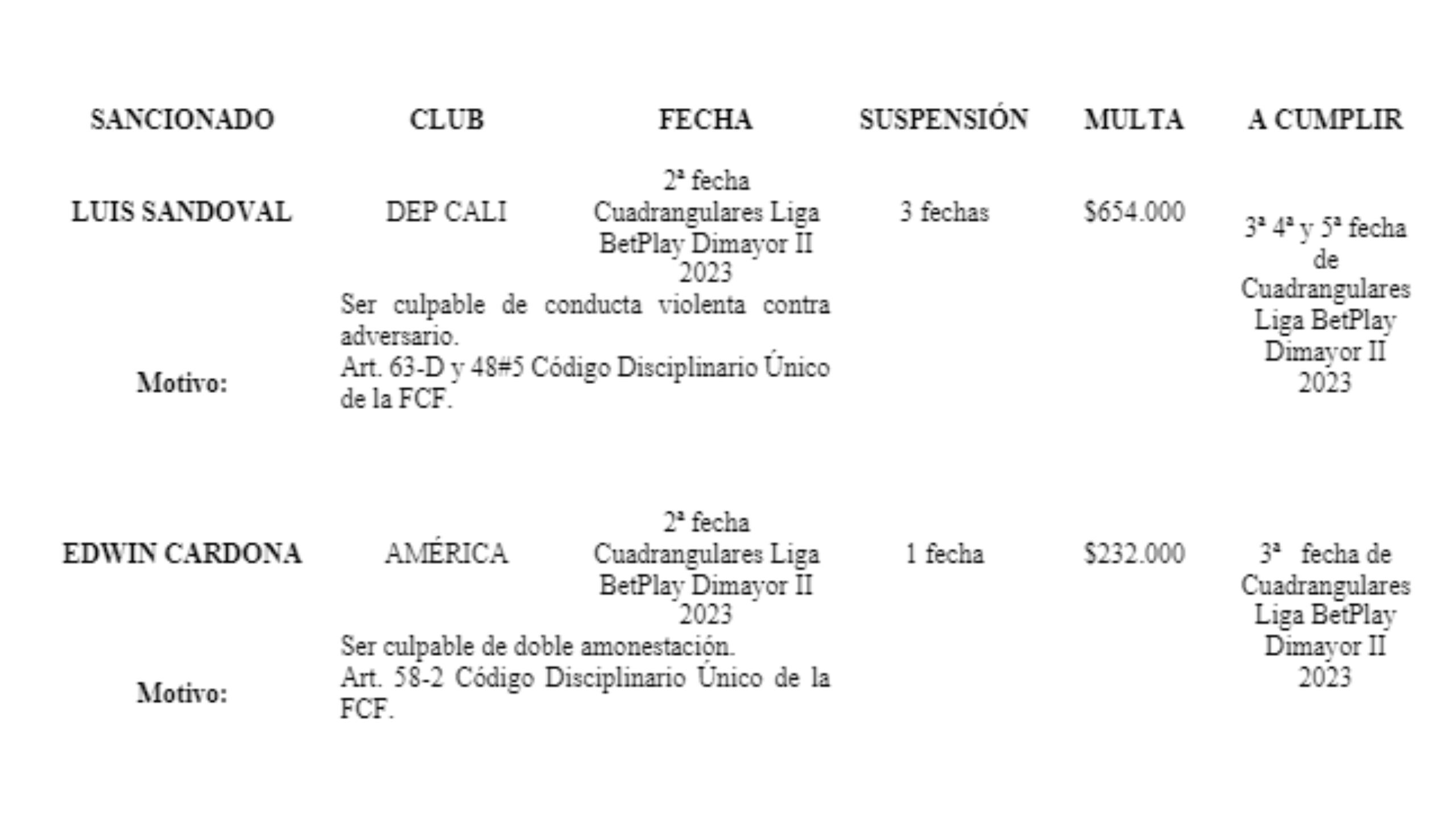 Luis Sandoval, Edwin Cardona y Daniel Londoño son los otros jugadores que aparecen en la lista y que tendrán sanciones más leves, excepto el ‘chino’ Sandoval, que pagará una suspensión de tres fechas y recién volverá para el cierre de los cuadrangulares.