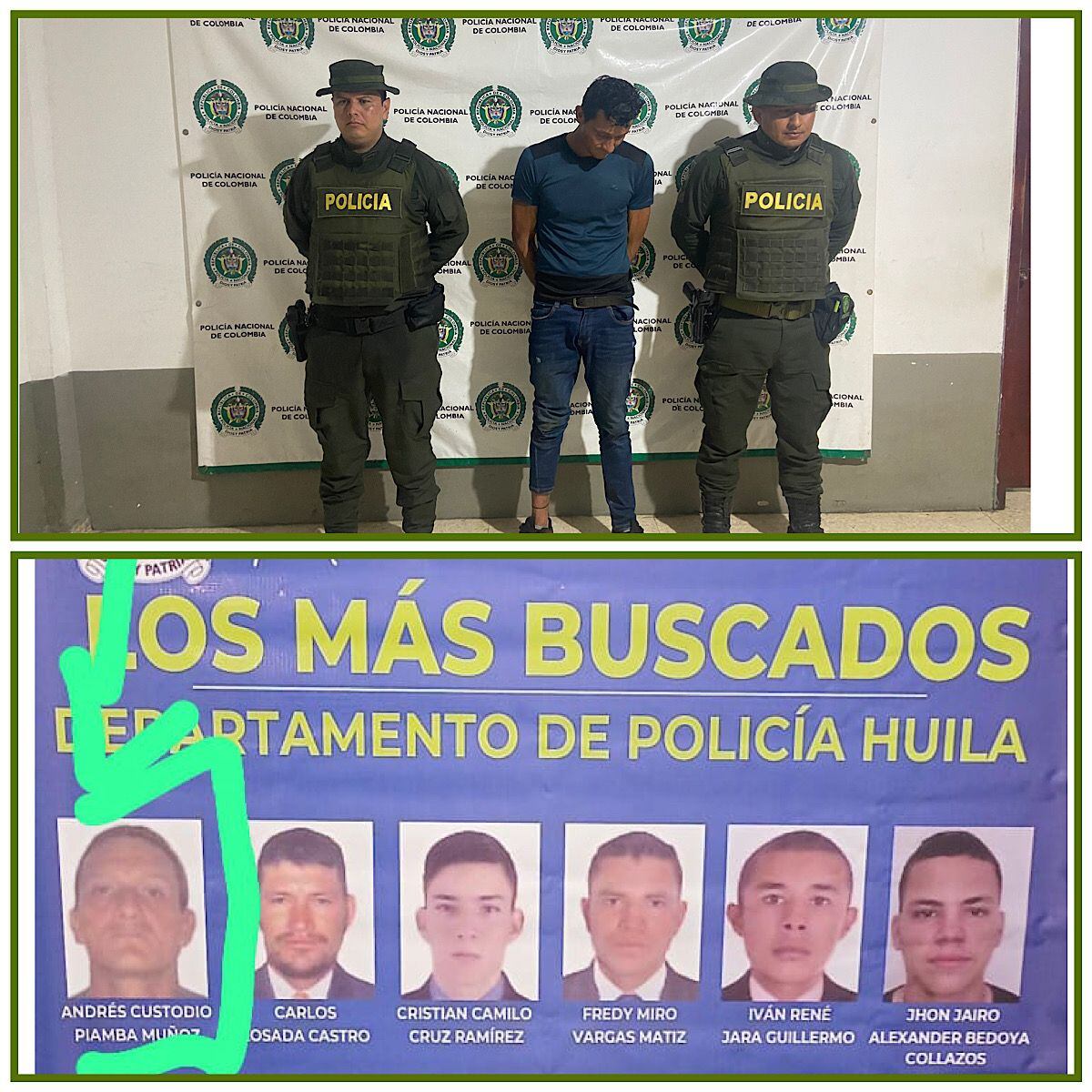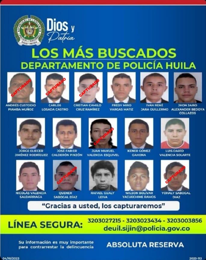 Gracias a la amplia difusión del cartel de los más buscados en el Departamento y la oportuna información suministrada por un ciudadano al personal de la Seccional de Investigación Judicial y Criminal del Huila y en coordinación con personal de SIJIN Caquetá se logró la ubicación y captura de ANDRES CUSTODIO PIAMBA MUÑOZ, el cual se encontraba huyendo de la justicia en el municipio de San José del Fragua Caquetá.