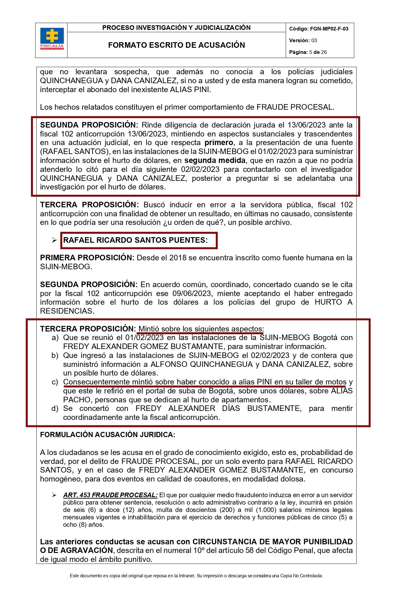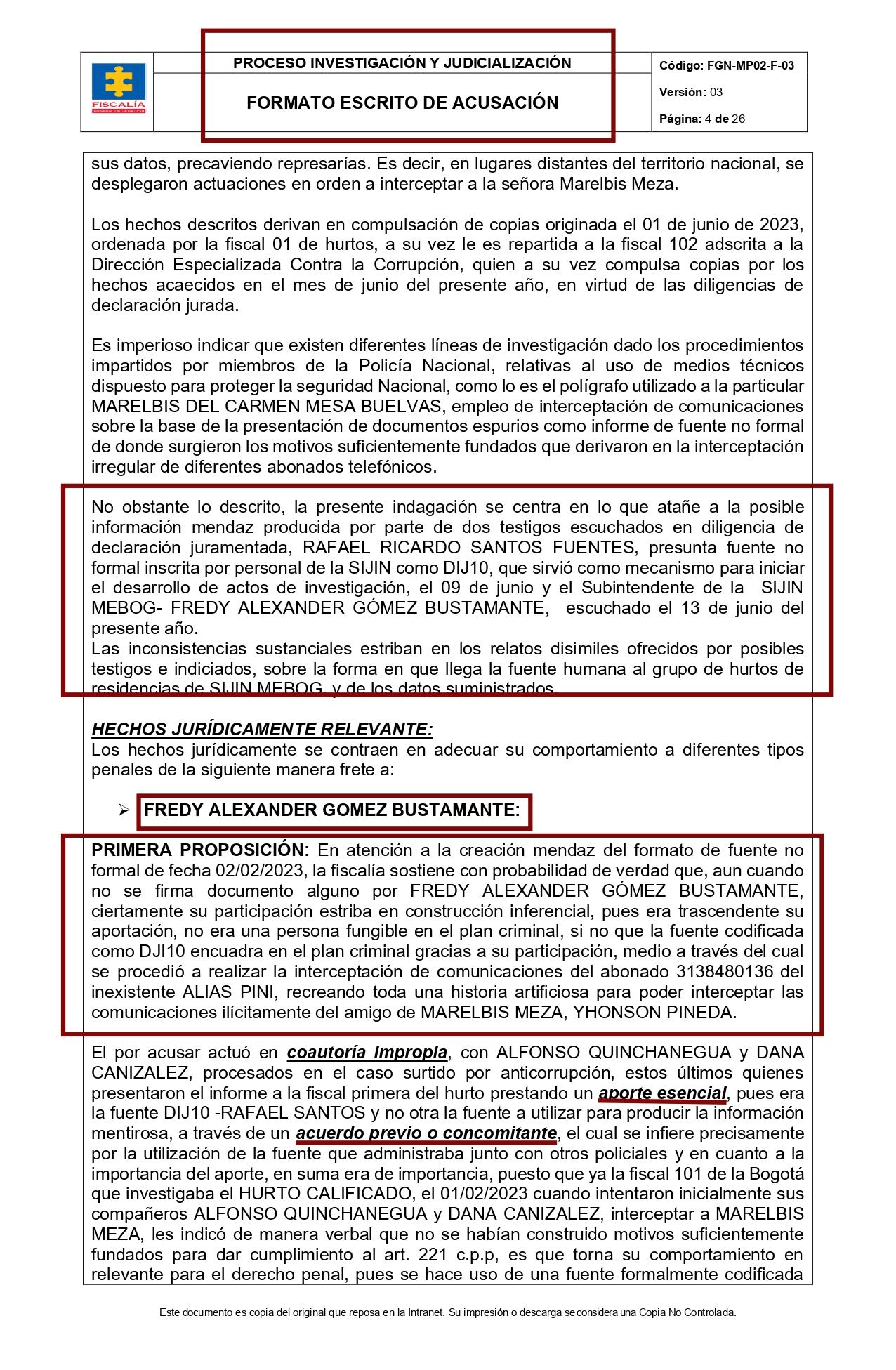 Escrito de acusación en contra Rafael Ricardo Santos, la supuesta “fuente humana falsa” y al agente de la SIJIN de Bogotá Fredy Alexander Gómez por el caso Marelbyz