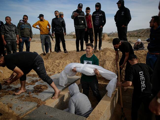 -FOTODELDÍA- KHAN YUNIS (GAZA), 22/11/2023.- Familiares de palestinos de la familia Siam que murieron tras los ataques aéreos israelíes contra un edificio que albergaba a personas desplazadas de la Franja de Gaza, lloran junto a sus cádaveres envueltos en sudarios en el exterior del Hospital Nasser en Khan Yunis, en el sur de la Franja de Gaza, este miércoles. Más de 12.500 palestinos y al menos 1.200 israelíes han muerto, según las Fuerzas de Defensa de Israel (FDI) y la autoridad sanitaria palestina, desde que militantes de Hamás lanzaron un ataque contra Israel desde la Franja de Gaza el 7 de octubre e Israel respondió con operaciones militares en Gaza y Cisjordania. EFE/ Mohammed Saber / MOHAMMED SABER (EFE)