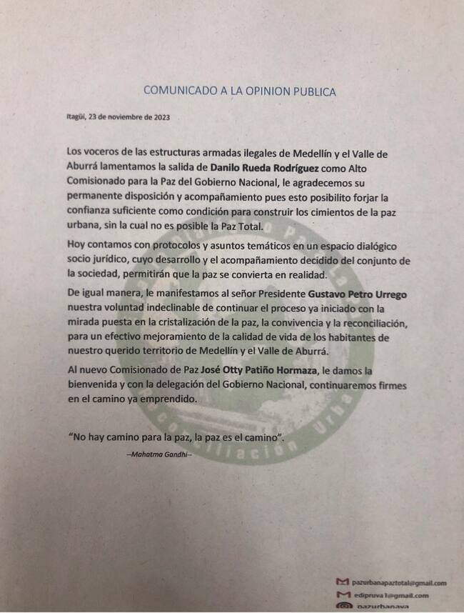 Luego de conocerse la salida del cargo de Danilo Rueda Alto Comisionado para La Paz y de los procesos de paz que se adelantan en el país actualmente con diferentes grupos ilegales del país, entre ellos, las estructuras armadas ilegales del Valle de Aburrá, estas últimas emitieron un comunicado oficial desde la cárcel La Paz de Itagüí por medio de sus voceros en el que lamentaron la decisión del Presidente Gustavo Petro, pero además, recalcaron que continuarán con el proceso.