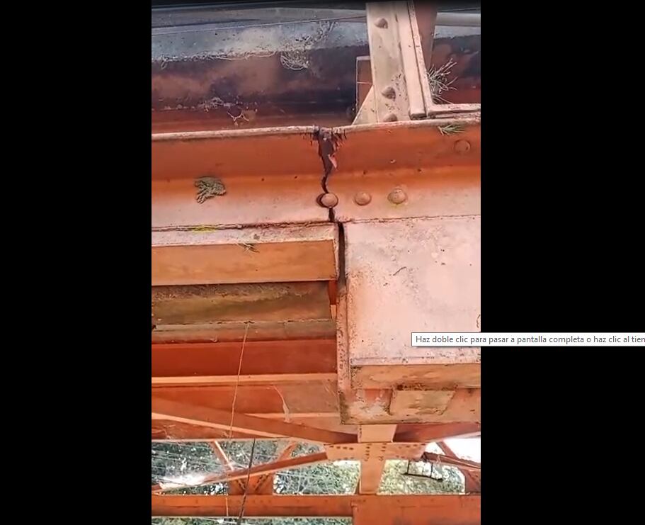 Se puede observar parte de la estructura agrietada y el movimiento del puente al paso de los vehículos de carga pesada.