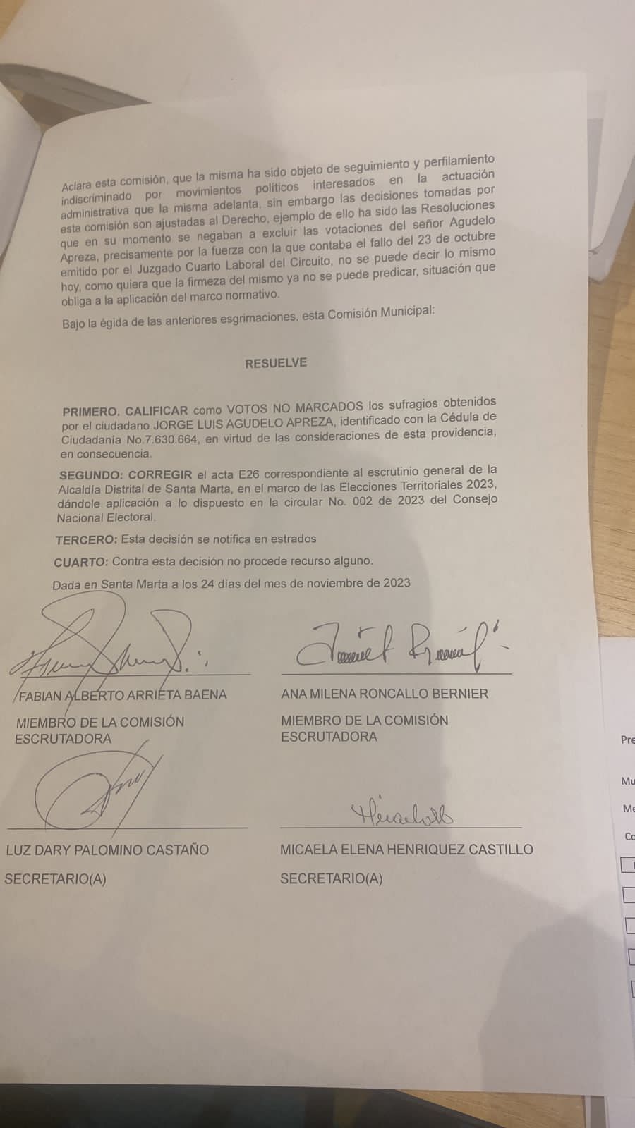 La Comisión Escrutadora de Santa Marta tomó la decisión de no contar los votos obtenidos en las elecciones del 29 de octubre por el candidato Jorge Agudelo, después de la decisión del Tribunal de Santa Marta de dejar sin efectos el fallo de tutela que ordenaba la inscripción del candidato de Fuerza Ciudadana.