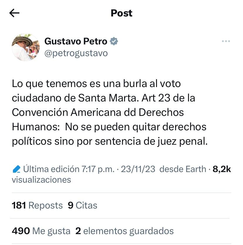 “Lo que tenemos es una burla al voto ciudadano de Santa Marta. Artículo 23 de la Convención Americana de Derechos Humanos: no se pueden quitar derechos políticos, sino por sentencia de juez penal”, escribió en su cuenta de X.